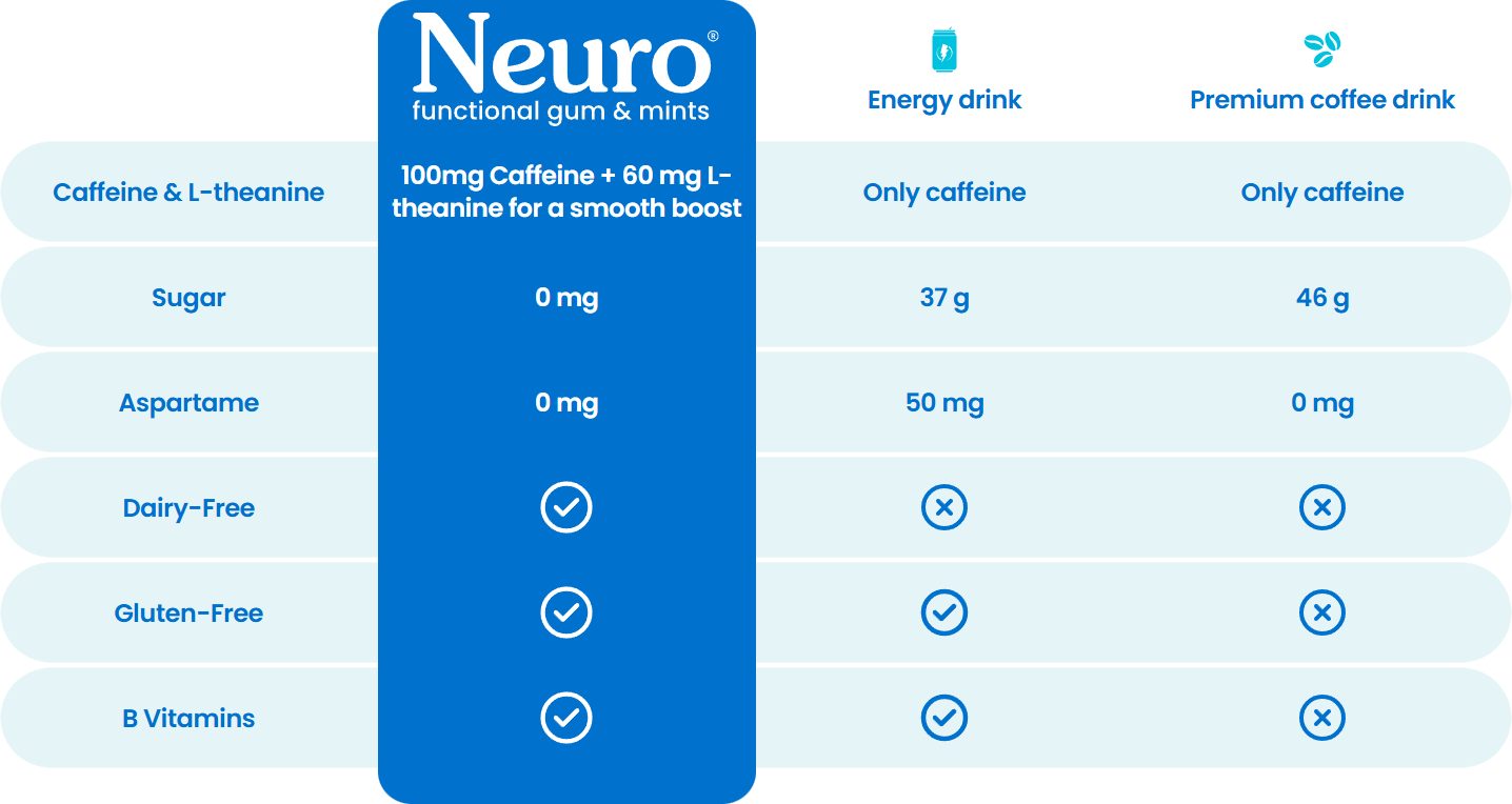 تمنحك تركيبتنا الحاصلة على براءة اختراع النسبة المثالية من الكافيين الطبيعي والثيانين لتمنحك طاقة متوازنة ومثالية تُغذي يومك دون الشعور بالتوتر أو الإرهاق المفاجئ.*